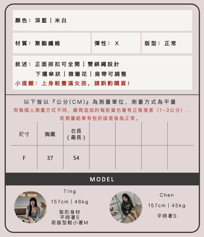 由於每台電腦或手機的顯示器不同,拍攝時室內外燈光也有所不同,小編會已最相近的相片顏色呈現給大家,若實體商品還是有些許色差皆為正常。
