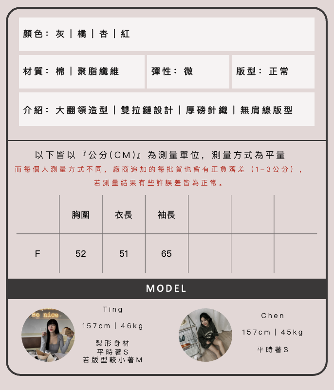 由於每台電腦或手機的顯示器不同,拍攝時室內外燈光也有所不同,小編會已最相近的相片顏色呈現給大家,若實體商品還是有些許色差皆為正常。